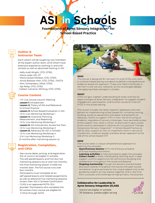 If you have not yet taken the CLASI CASI, ASI in Schools is a great place to start. The course provides an introduction to ASI theory and supports learners’ ability to know when and how to apply concepts of Ayres Sensory Integration® to support student engagement, participation, and function across all 3 tiers of MTSS in the school setting. The course addresses common barriers to implementing school-based ASI and presents an Advocacy Toolkit to support OTPs in their role of ensuring all students, regardless of sensory challenges, have equitable access to the support they need in school. Upon completion, if SBOTs want to continue their learning in ASI and become certified to conduct the EASI, we welcome you to enroll in the CLASI CASI.
